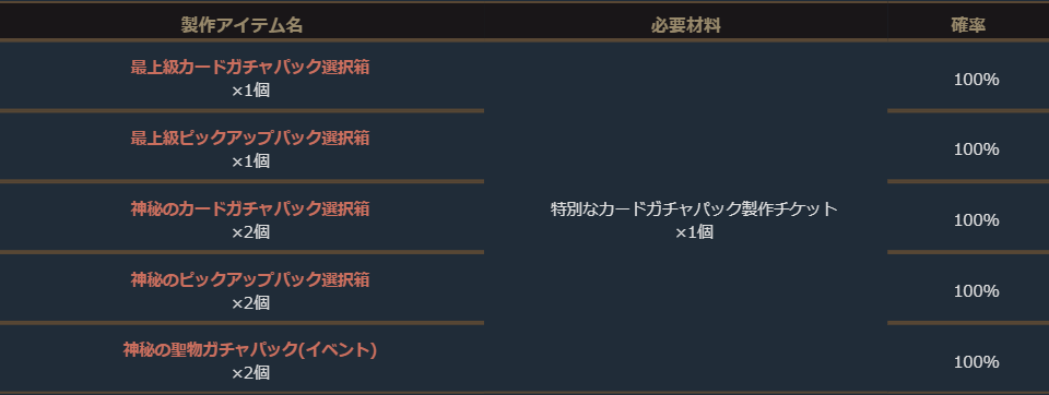 様々なアイテムと一緒に、「特別なカードガチャパック製作チケット」での「最上級カードガチャパック選択箱」や「最上級ピックアップパック選択箱」等の製作に加え、