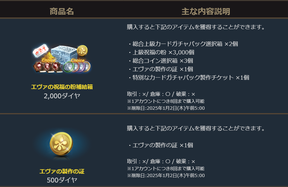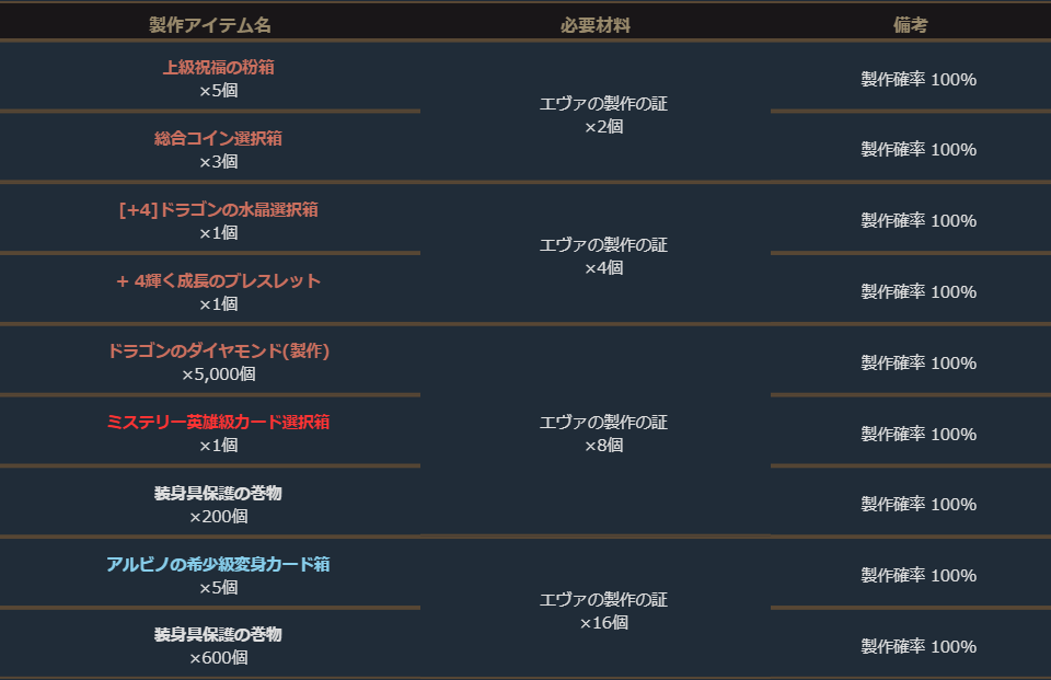 「エヴァの製作の証」では「ドラゴンのダイヤモンド(製作)5,000個」や「装身具保護の巻物600個」等の製作が可能です。