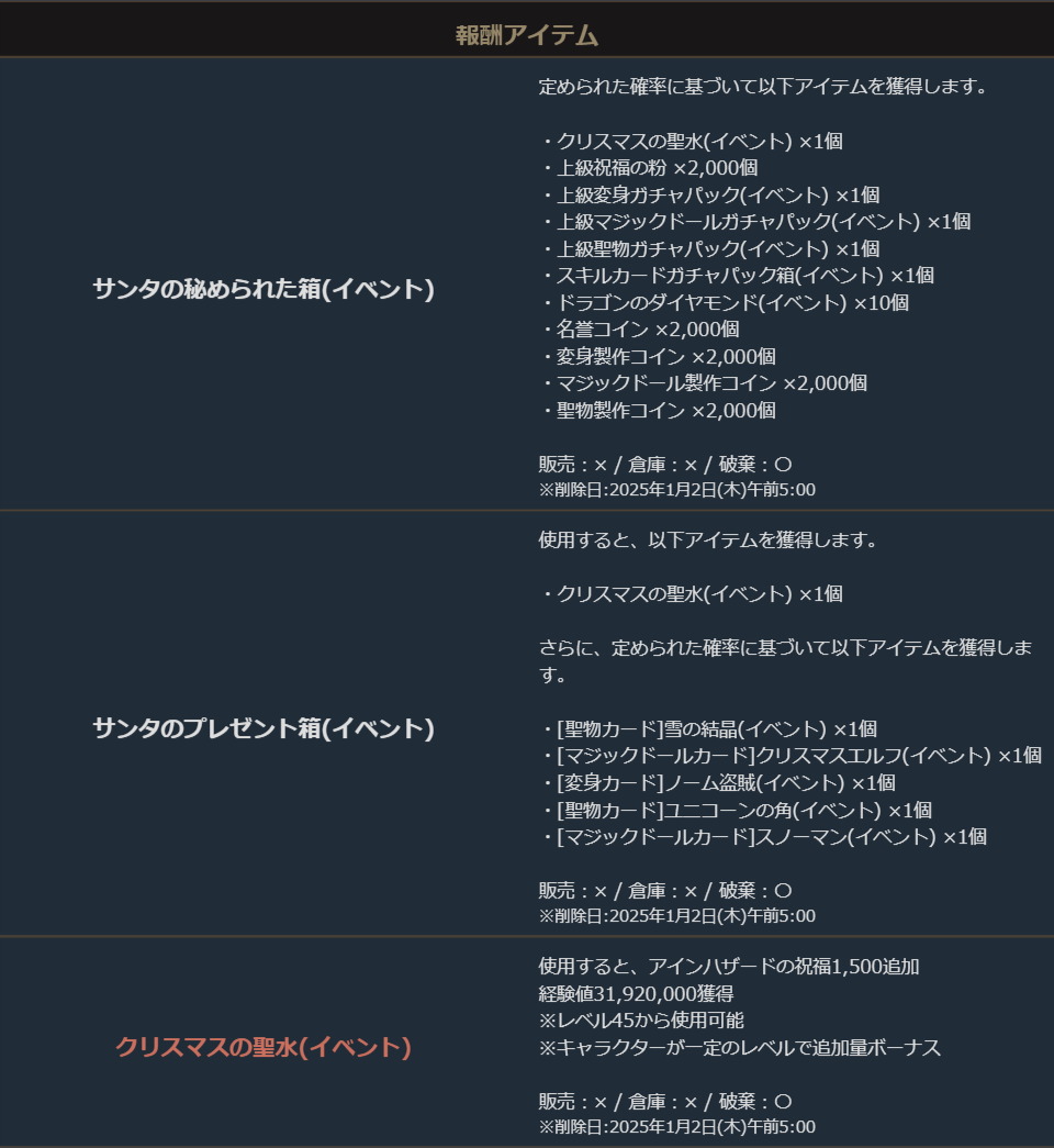 ※一部アイテムが期間終了後も未使用の場合、一定期間が経過すると自動で削除されます。詳しくは各アイテムの詳細をご確認ください。