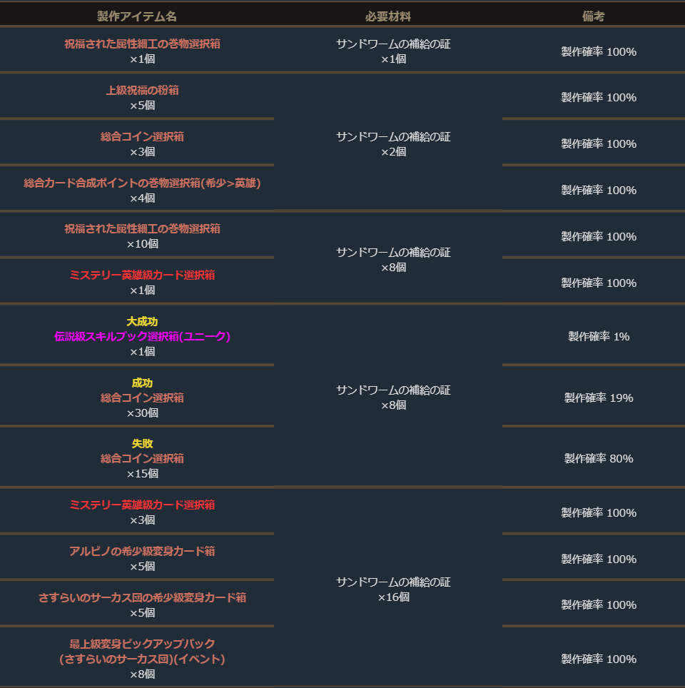 さらに、付属の「サンドワームの補給の証」を素材に「伝説級スキルブック選択箱(ユニーク)」等の製作にチャレンジが可能です。
