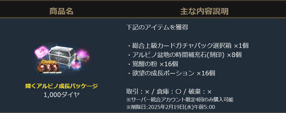 「アルビノ盆地の時間補充石(刻印)」8個、「覚醒の粉」16個、「欲望の成長ポーション」16個、「総合上級カードガチャパック選択箱」1個を獲得できます。