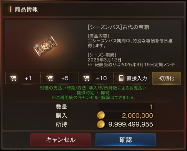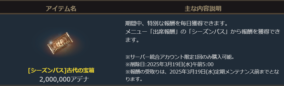 「[シーズンパス]古代の宝箱」は2,000,000アデナ、「[スペシャルシーズンパス]古代の宝箱」は1,200ダイヤでそれぞれ購入できます。