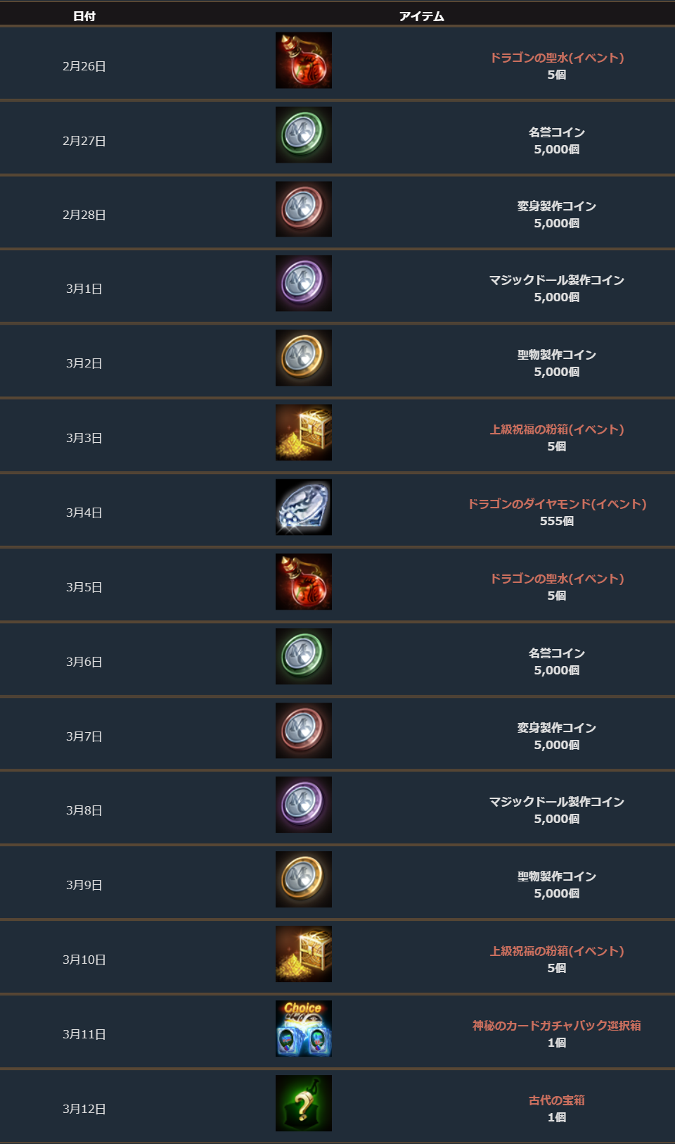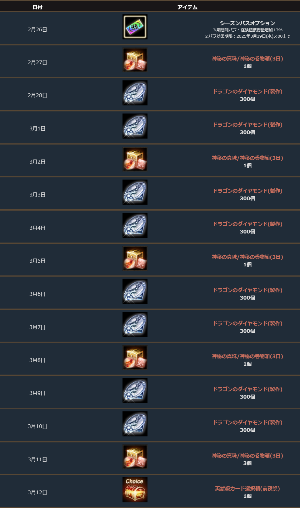 下記の日付以降にそれぞれの報酬を獲得できます。
