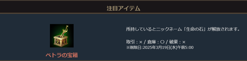 「古代の宝箱」が「ペトラの宝箱」に変化したため、注目アイテムとニックネームを追記しました。