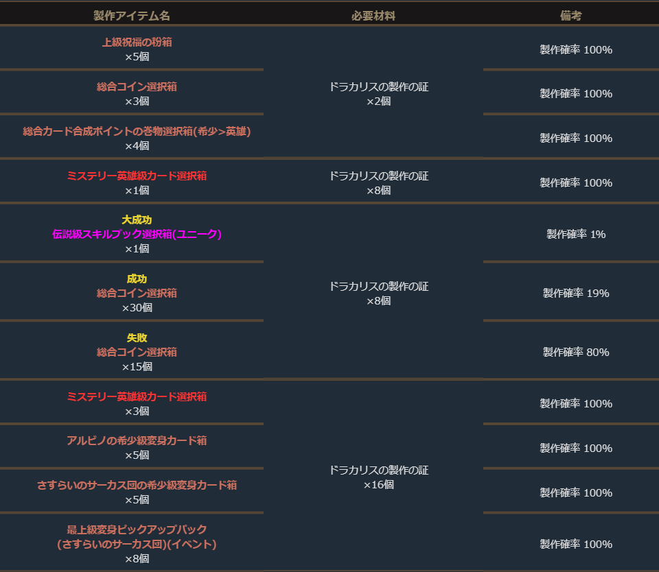 さらに、付属の「ドラカリスの製作の証」を素材に「伝説級スキルブック選択箱(ユニーク)」等の製作にチャレンジが可能です。