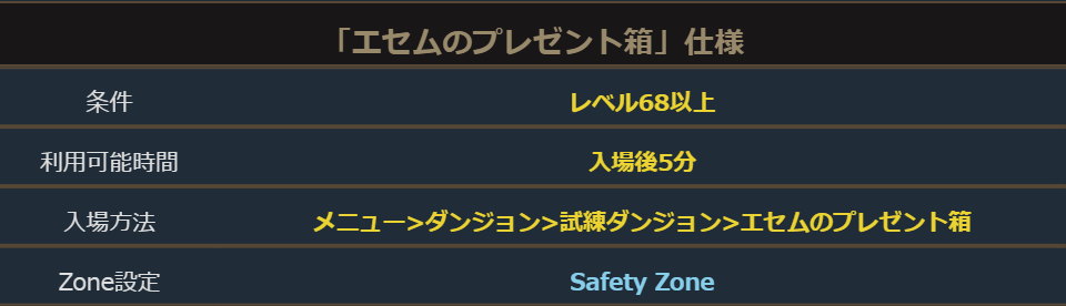 「エセムのプレゼント箱」はレベル68以上のキャラクターが入場できるダンジョンになっています。