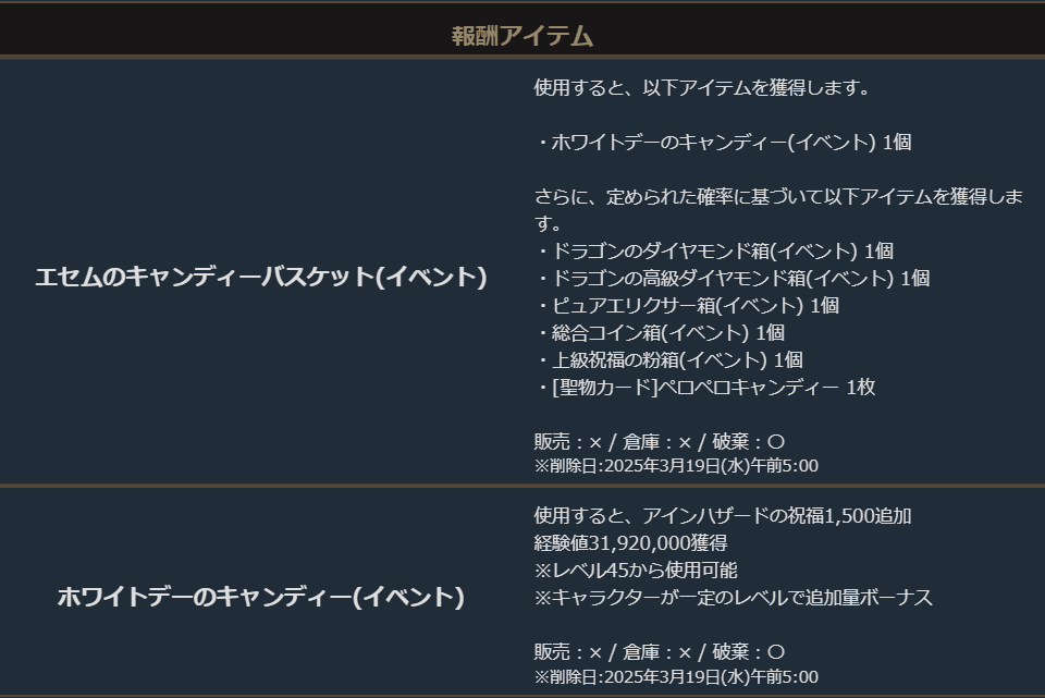 ※一部アイテムが期間終了後も未使用の場合、一定期間が経過すると自動で削除されます。詳しくは各アイテムの詳細をご確認ください。