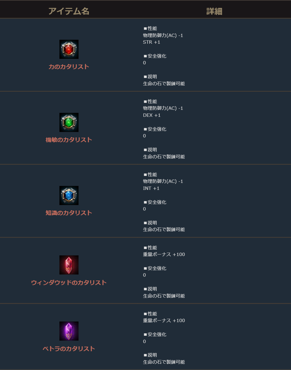 カタリストは「生命の石」を素材に「製錬」を行う事で追加効果を付与することができます。