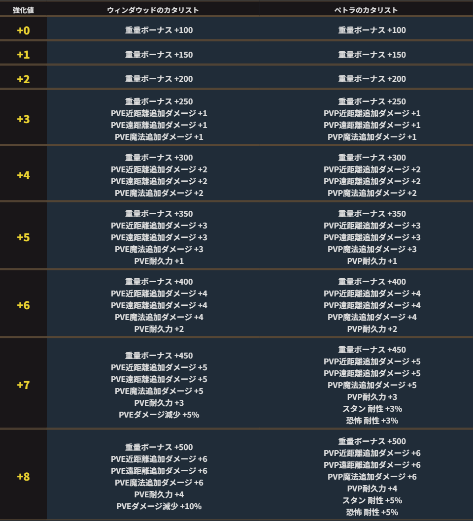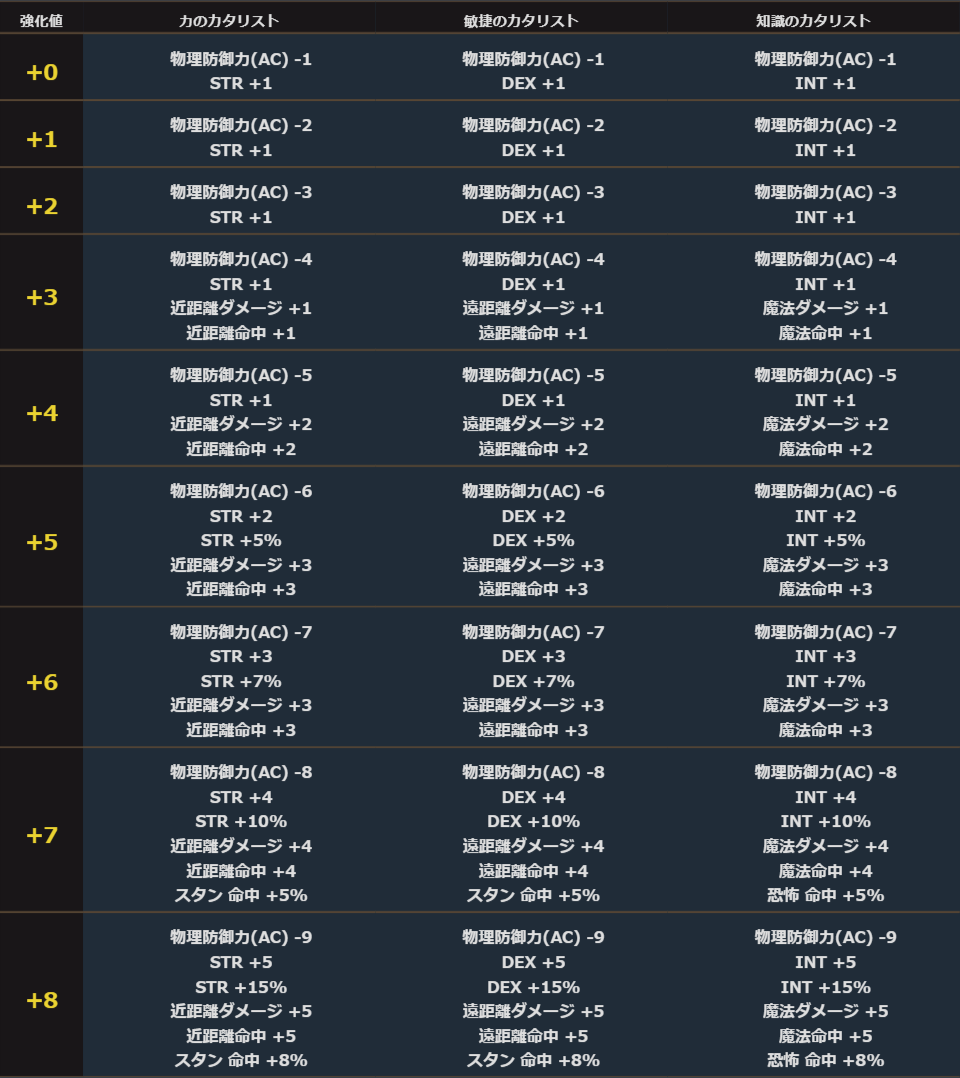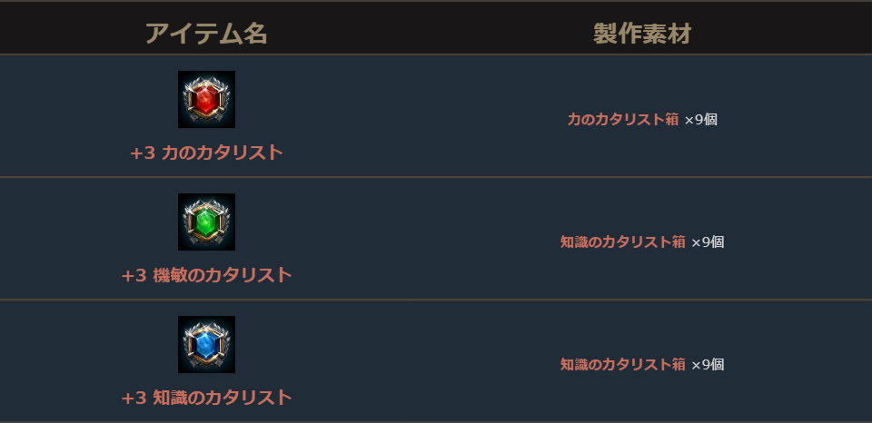 「力/機敏/知識のカタリスト」には新規効果の「ステータス増幅」が適用されます。