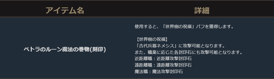上記「ペトラのルーン魔法の巻物」を使用し、「世界樹の祝福」バフを付与すると封印石3種およびボスを攻撃可能な状態になります。