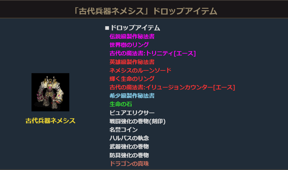 毎日22:30に「封印石3種(近距離/遠距離/魔法)」とボスモンスター「古代兵器ネメシス」が同時に出現します。