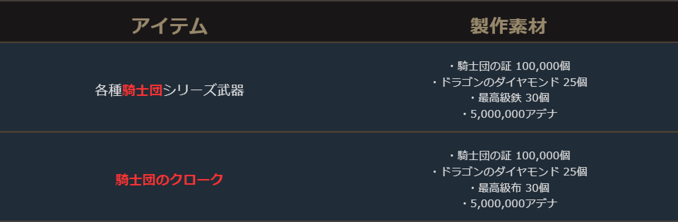 騎士団シリーズの武器と「騎士団のクローク」の製作を追加しました。