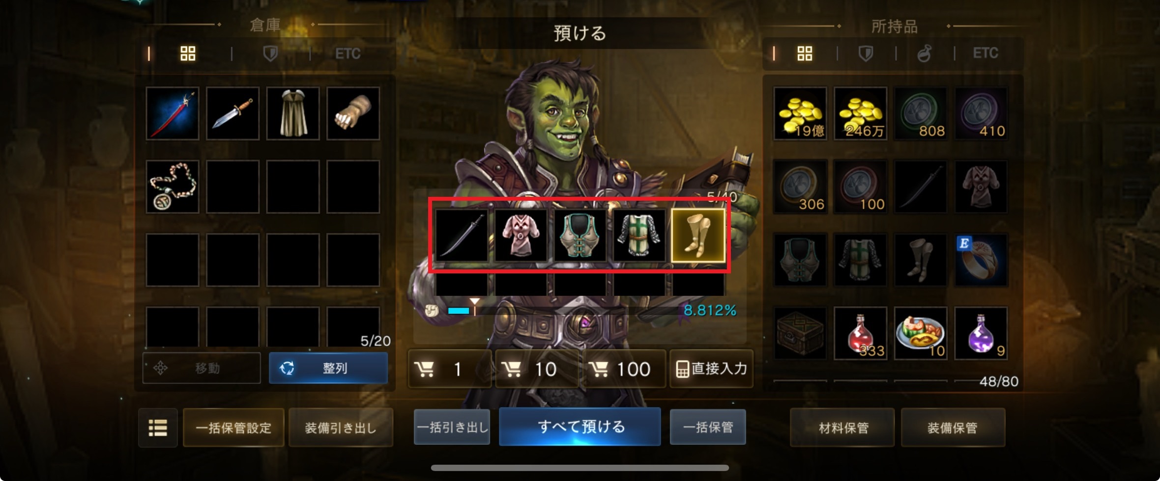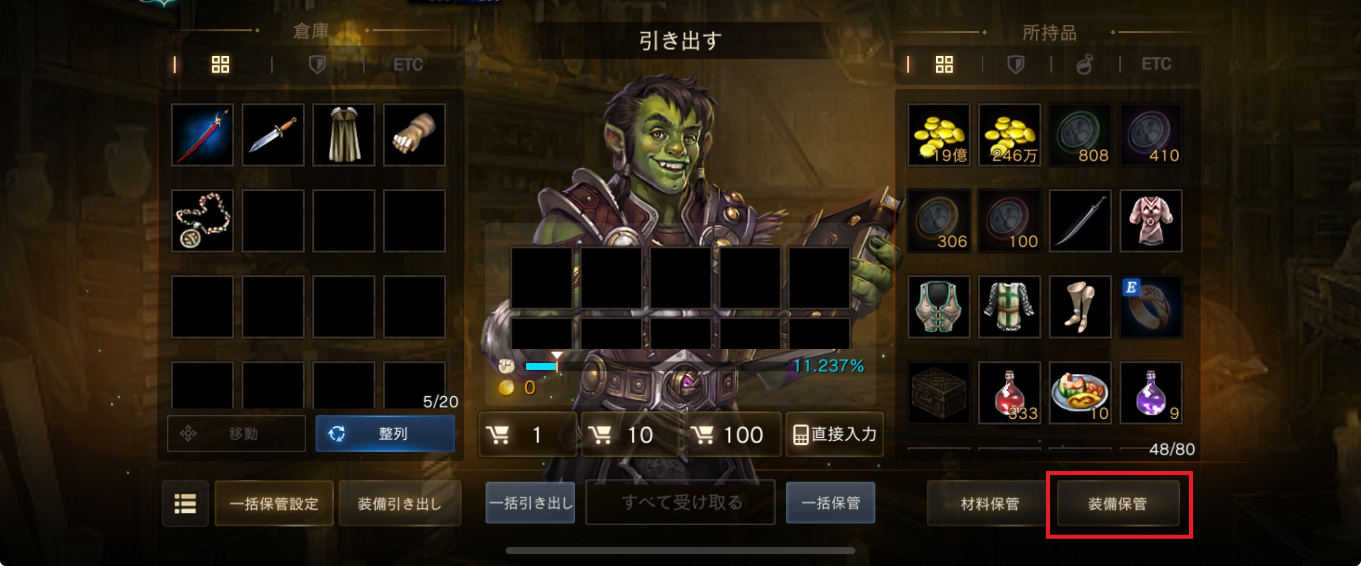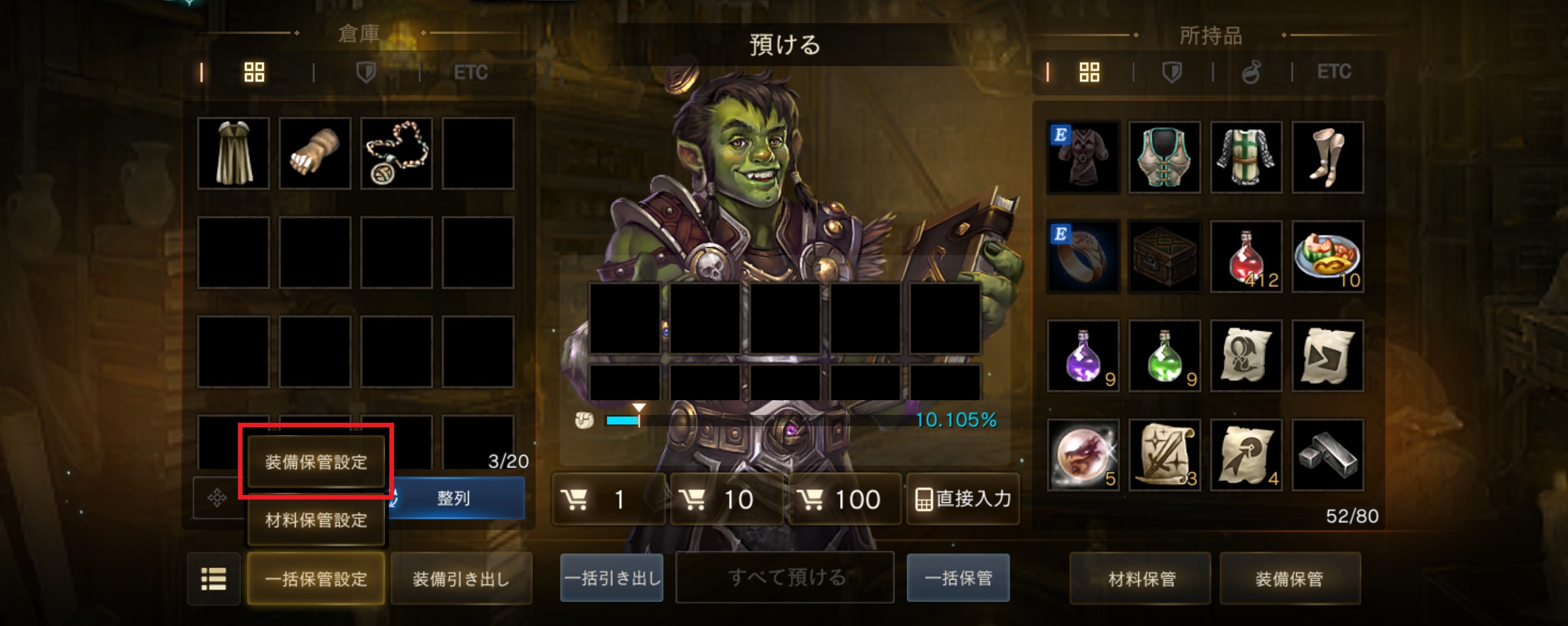 設定完了後、「装備保管」ボタンをタップする事で「装備保管設定」で設定した装備アイテムがインベントリから倉庫移動スロットに移動されます。