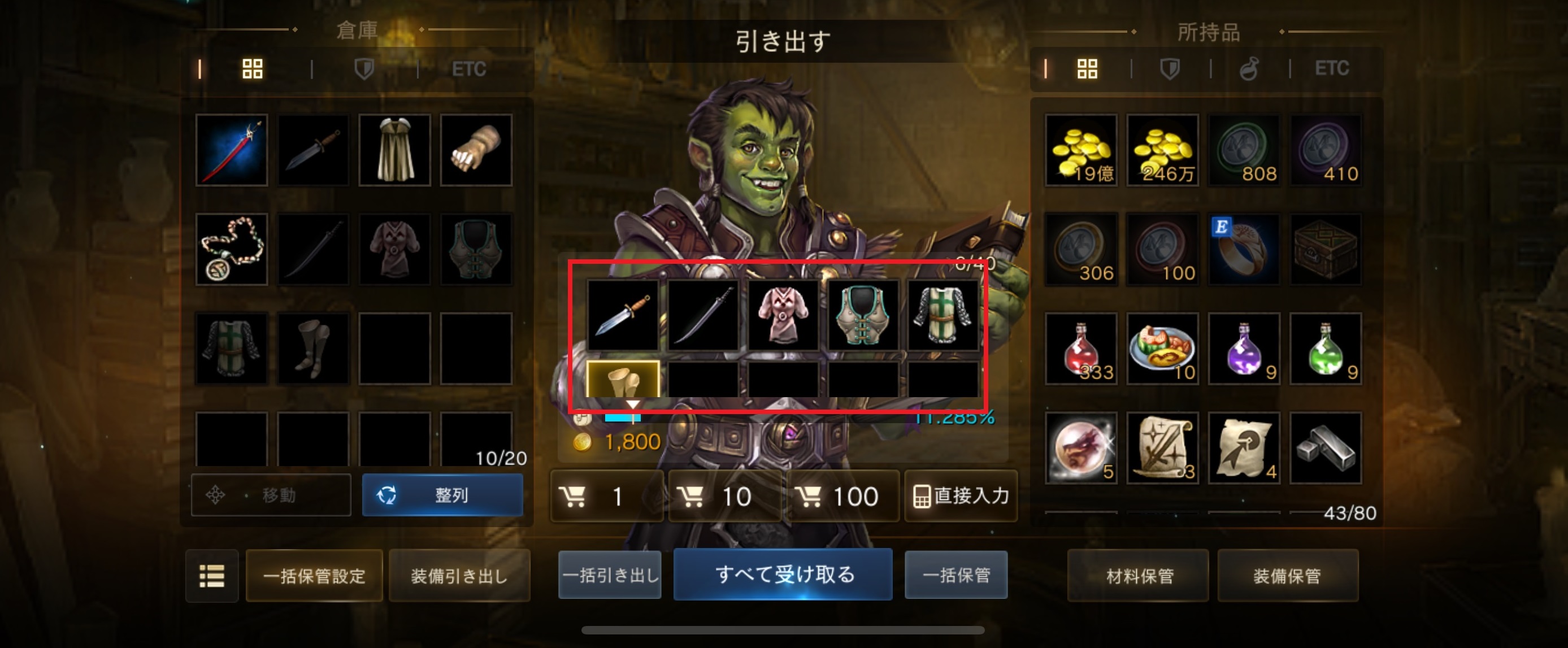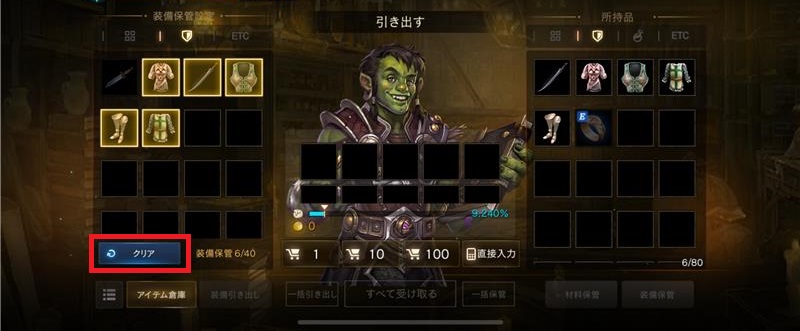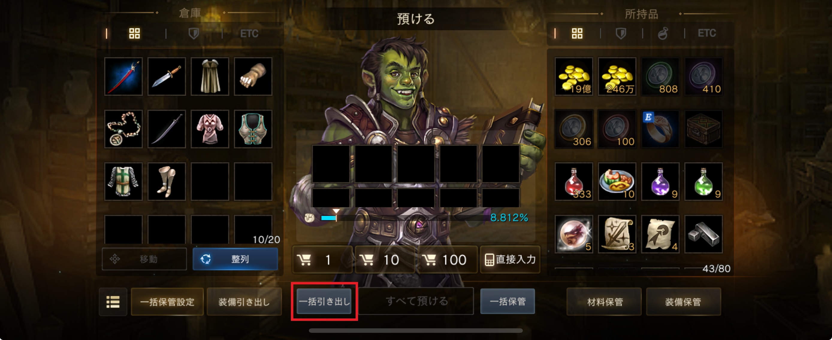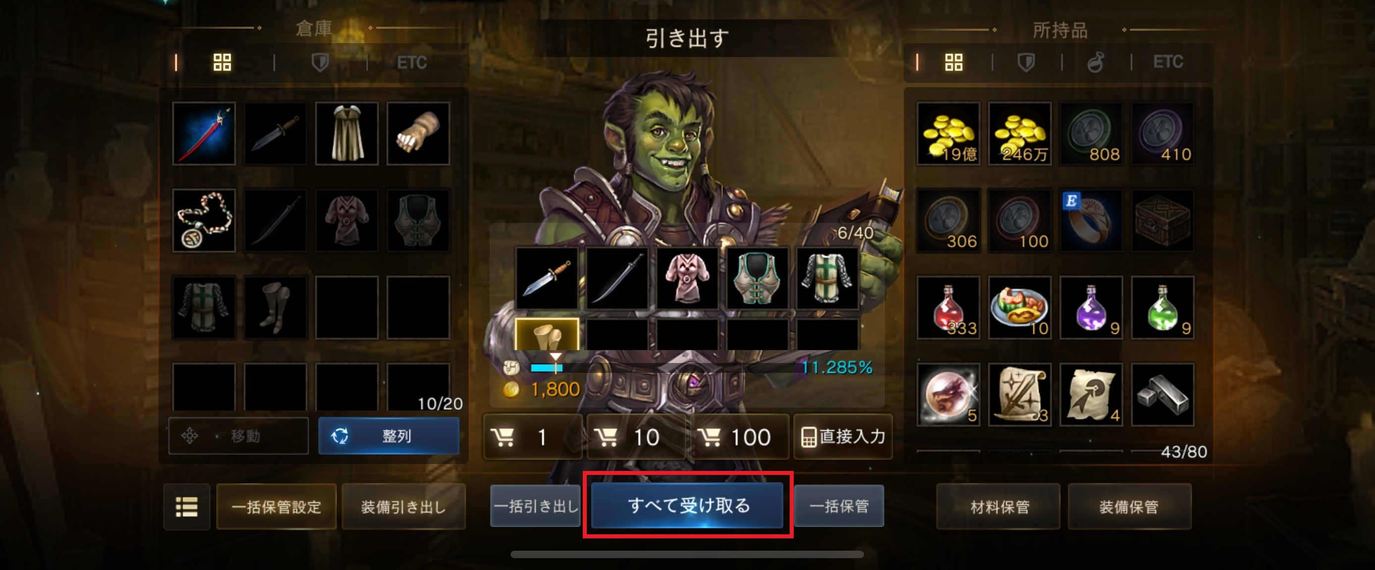 「一括引き出し」ボタンをタップ時、倉庫から最大40個のアイテムを一括選択して倉庫移動スロットに移動され、「すべて受け取る」ボタンを押す事でインベントリに移動可能です。