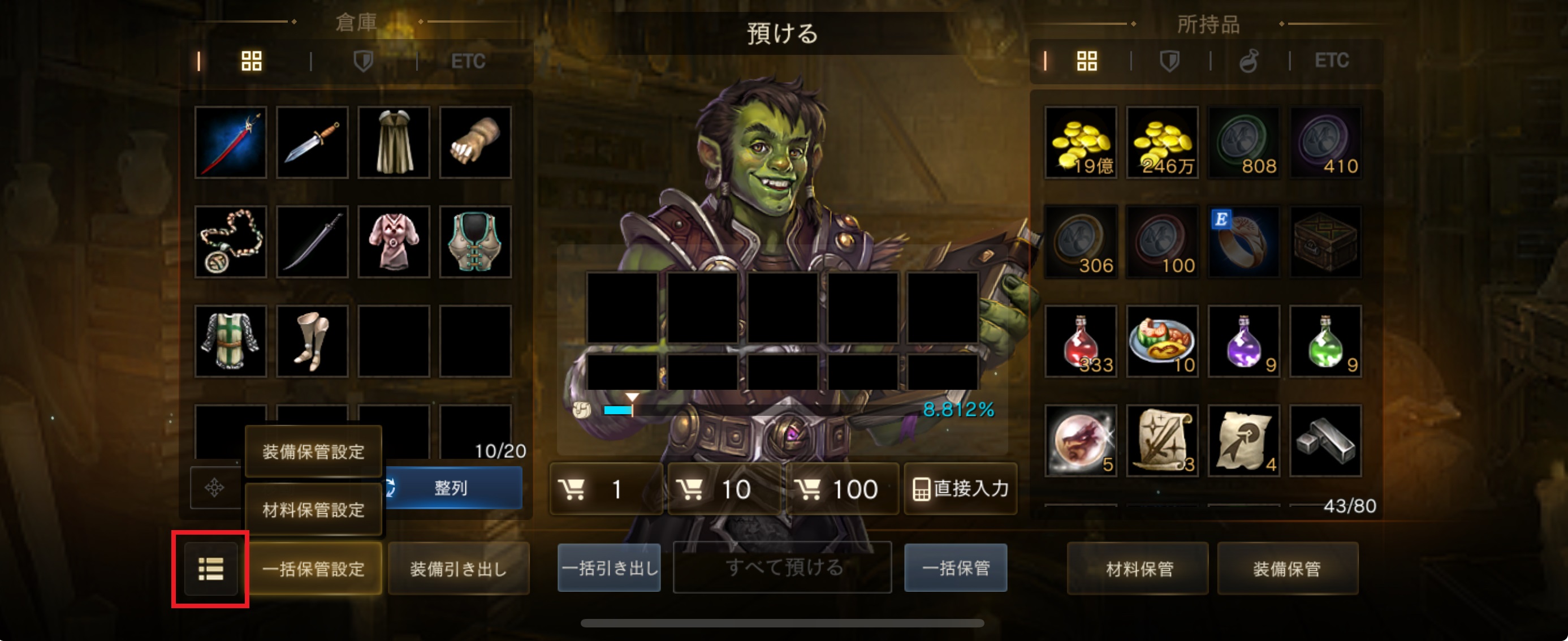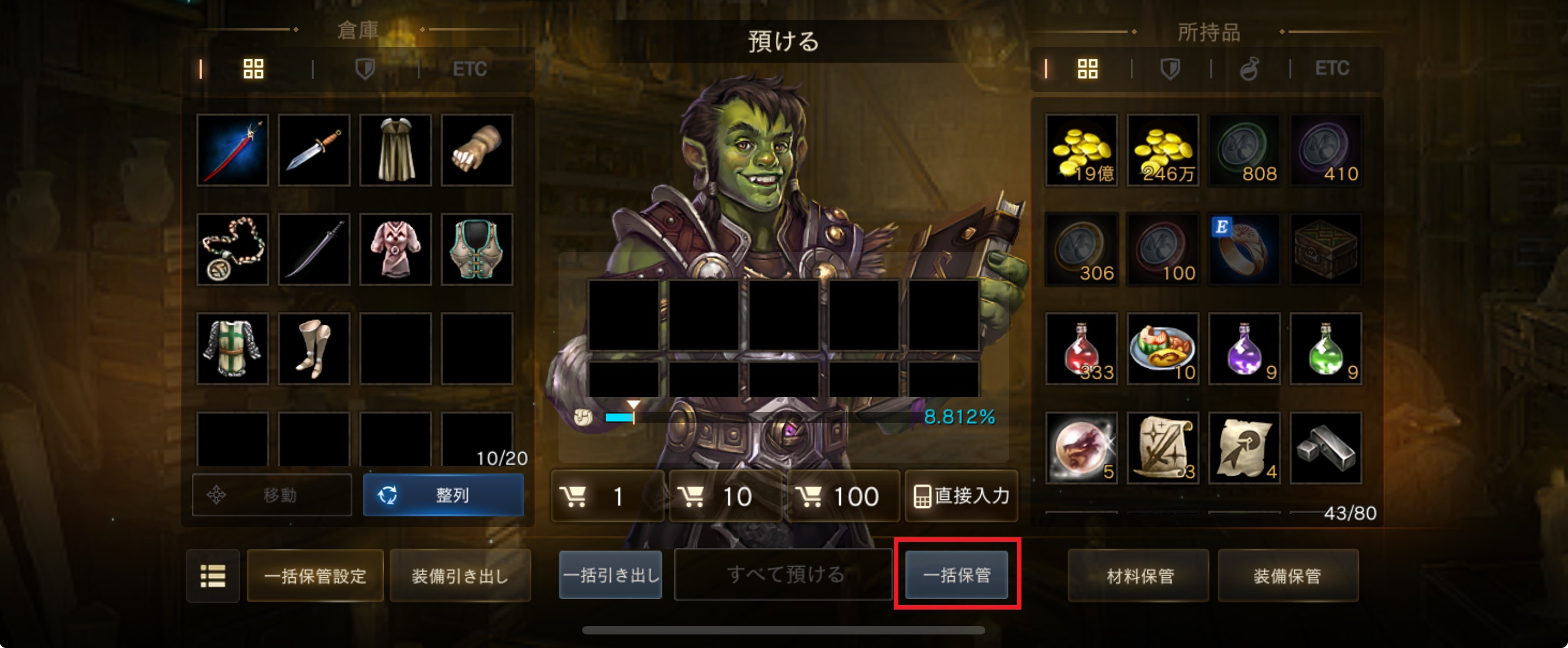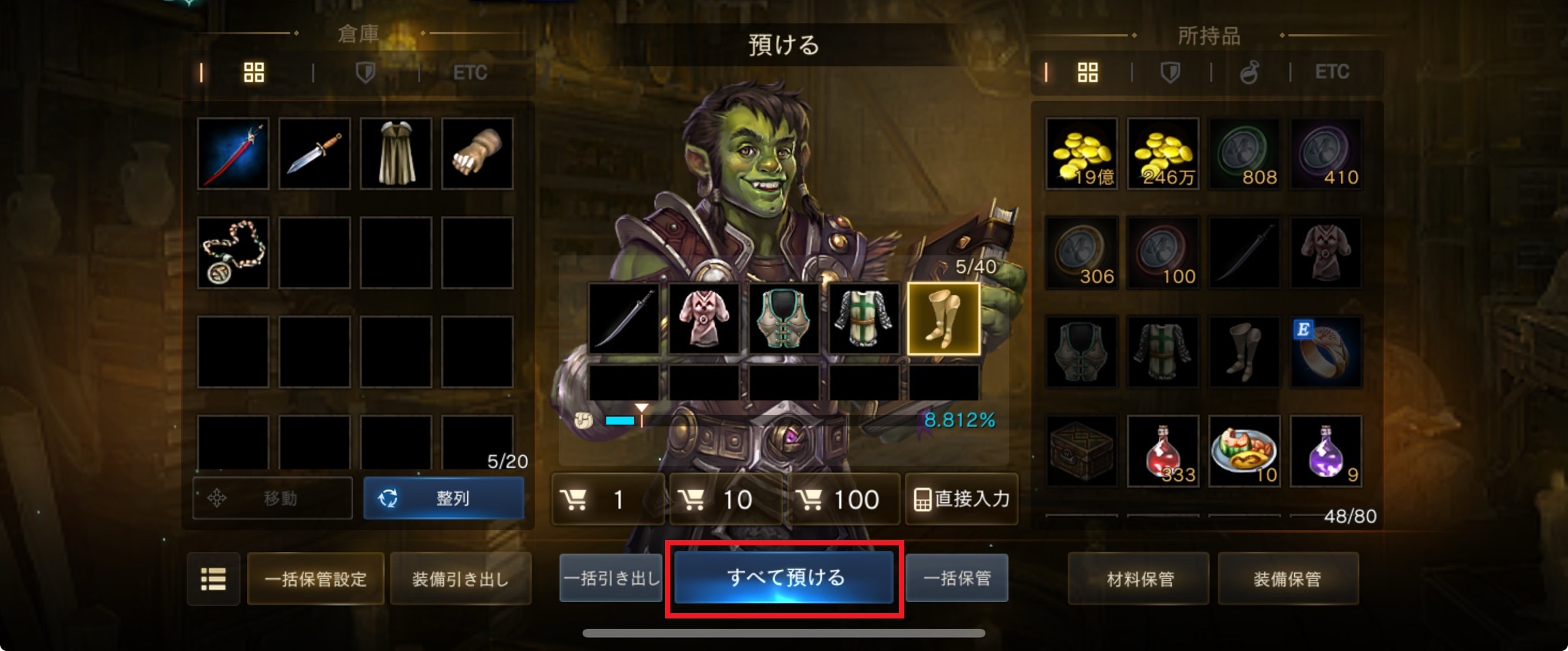「一括保管」ボタンをタップ時、インベントリで最大40個のアイテムを一括選択して倉庫移動スロットに移動され、「すべて預ける」ボタンを押す事で倉庫保管ができます。