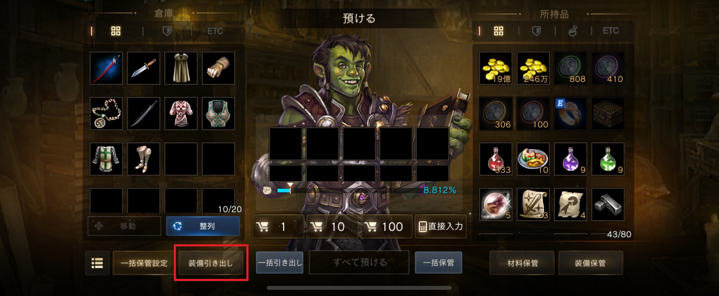 また、「装備保管設定」で設定した装備を一括で取り出すときは「装備引き出し」ボタンをタップする事で、倉庫から倉庫移動スロットに移動されます。