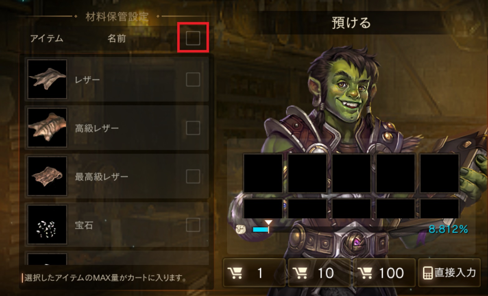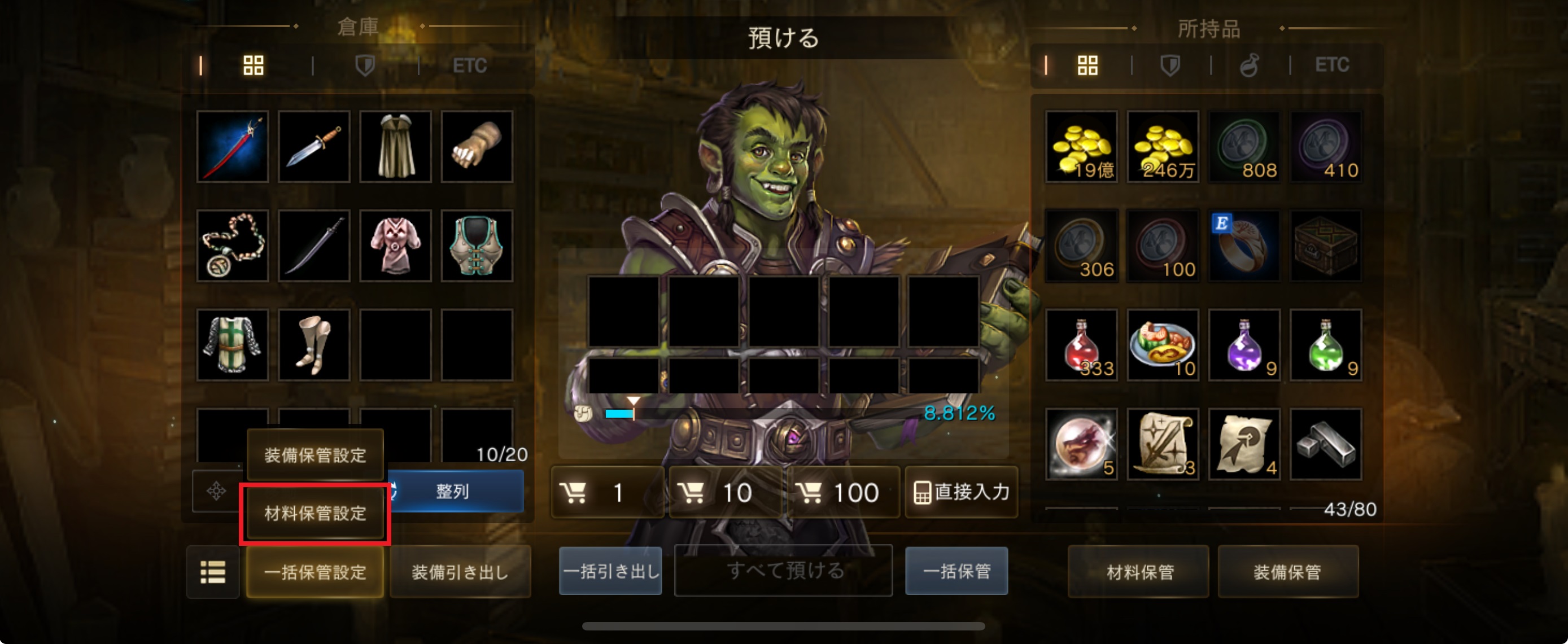 ※材料保管設定モードで設定したアイテムは「材料保管」ボタンで倉庫移動可能です。