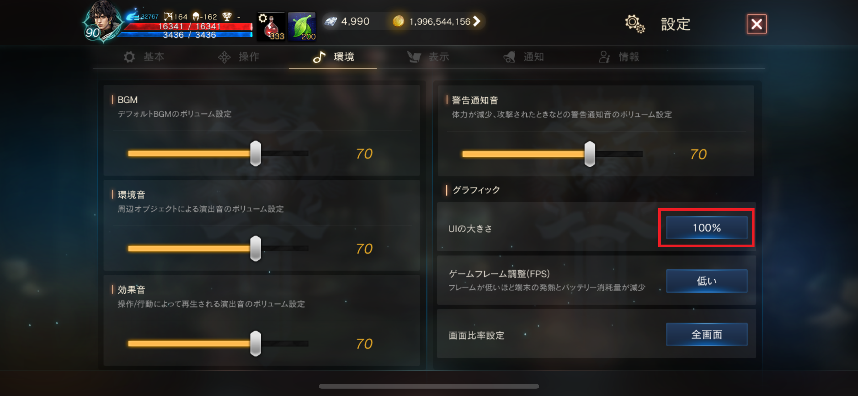ゲーム内メニュー>設定>環境タブ>グラフィック項目の「UIの大きさ」から調整できます。
