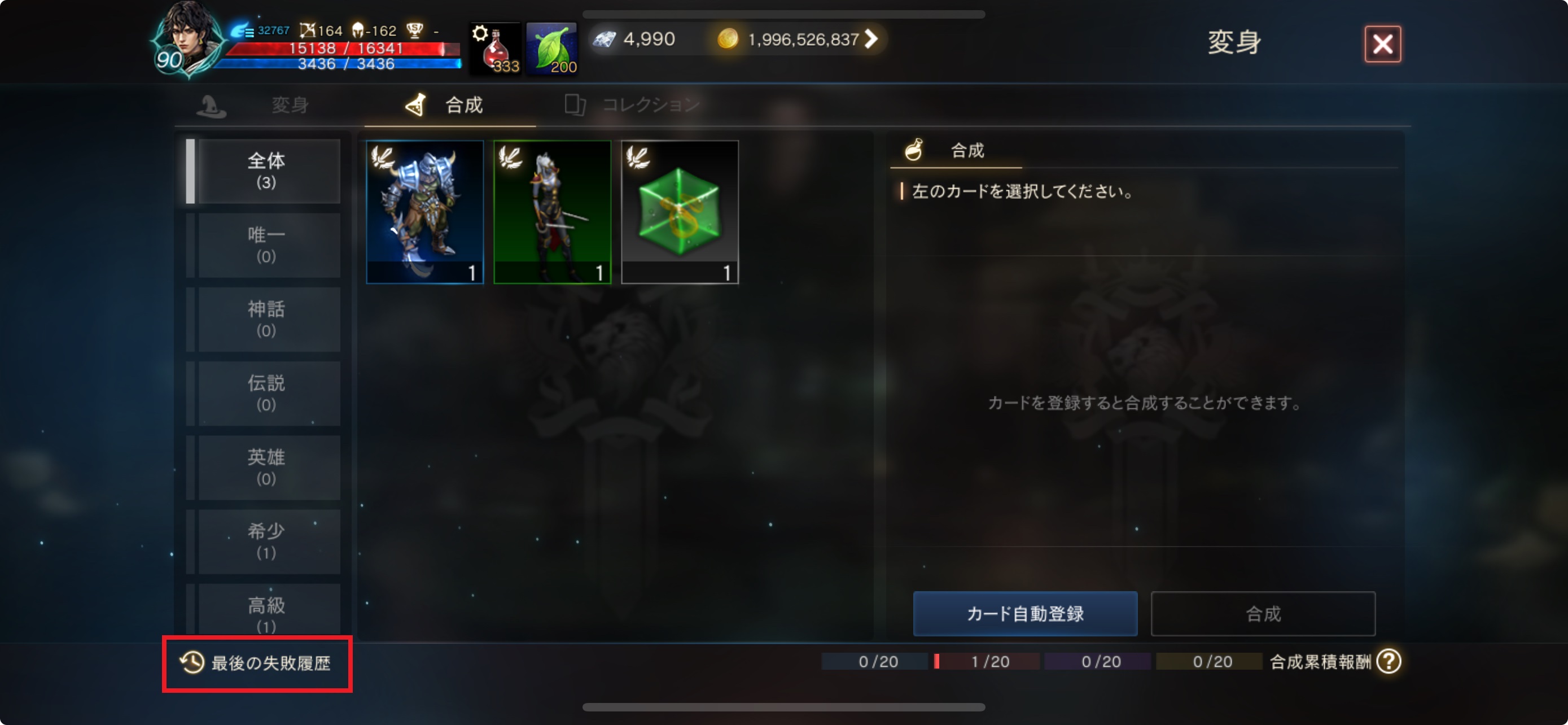 各カードの「合成」タブの左下に追加された「最後の失敗履歴」ボタンで確認できます。