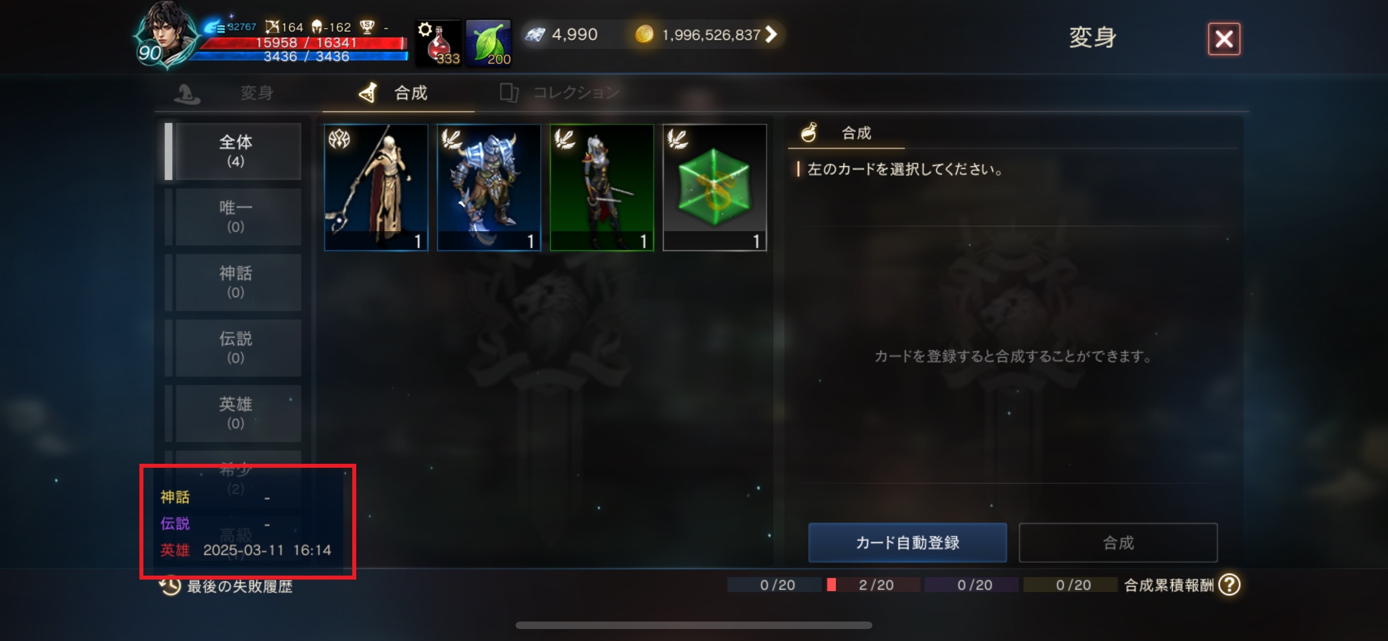 ※変身/マジックドール/聖物カードの失敗履歴はアカウント単位で計上され、スキルカードはキャラクター単位で計上されます。