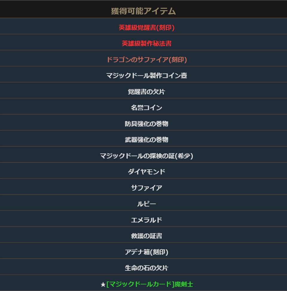 ※「★」マークが付いたアイテムは覚醒レベルがLv20に達したマジックドールで探検を行う場合のみ獲得が可能です。