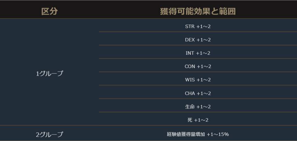 「力/機敏/知識のカタリスト」は製錬時に効果グループ1のうち1つ、効果グループ2のうち1つの合計2つの効果を付与することができます。