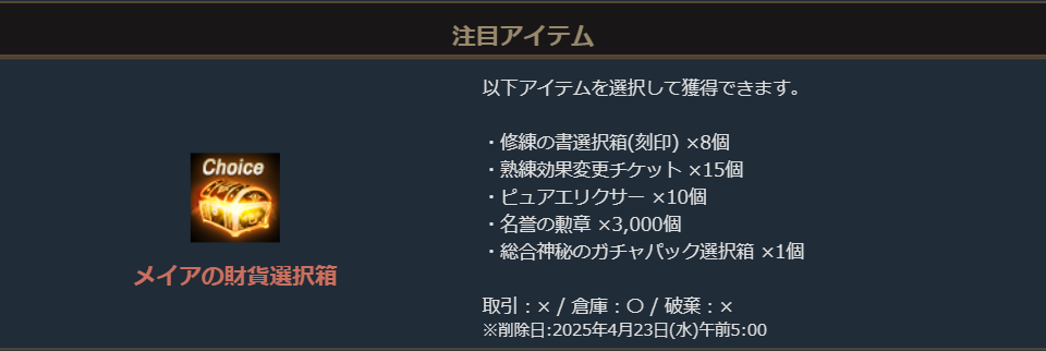※一部アイテムは未使用の場合、一定期間が経過すると自動で削除されます。詳しくは各アイテムの詳細をご確認ください。