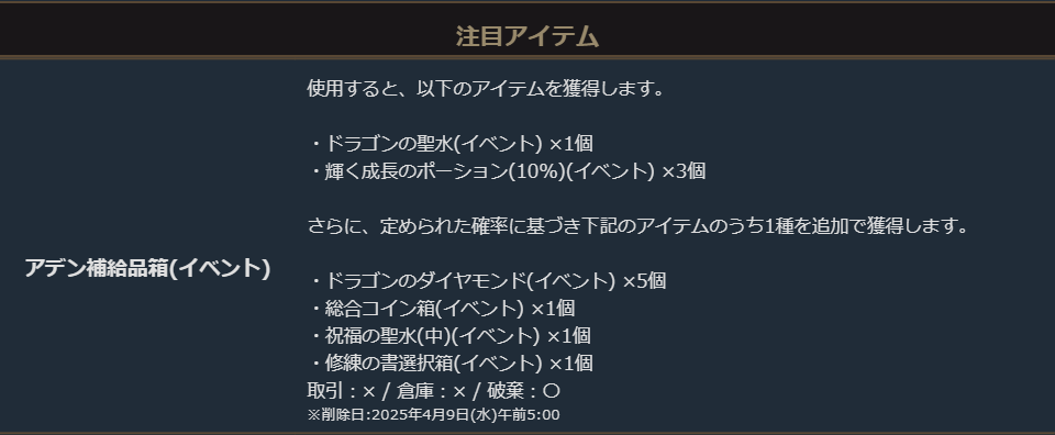 ※一部アイテムは未使用の場合、一定期間が経過すると自動で削除されます。詳しくは各アイテムの詳細をご確認ください。