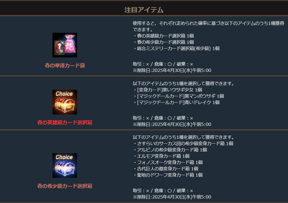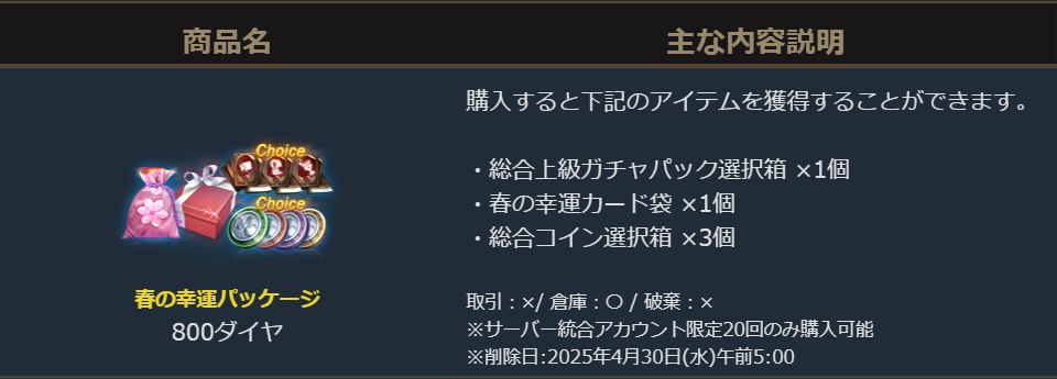 「総合上級ガチャパック選択箱」1個と「春の幸運カード袋」1個と「総合コイン選択箱」3個が獲得できます。