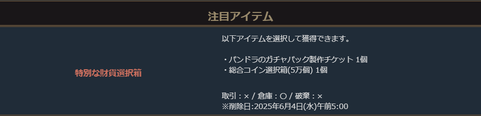 ※一部アイテムは未使用の場合、一定期間が経過すると自動で削除されます。詳しくは各アイテムの詳細をご確認ください。