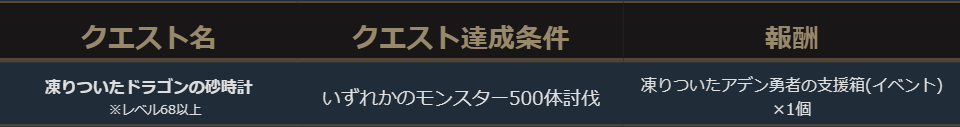 期間中、イベントクエスト「凍りついたドラゴンの砂時計」より「凍りついたアデン勇者の支援箱(イベント)」の獲得が可能になります。