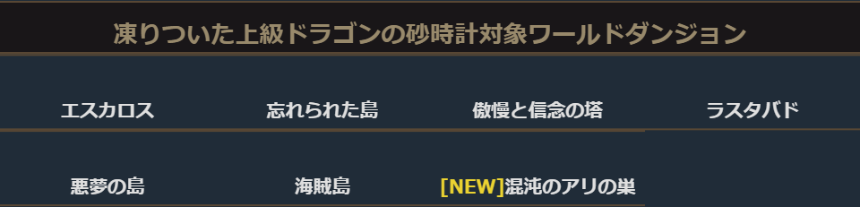 「凍りついた上級ドラゴンの砂時計(イベント)」の対象のワールドダンジョンは以下になります。