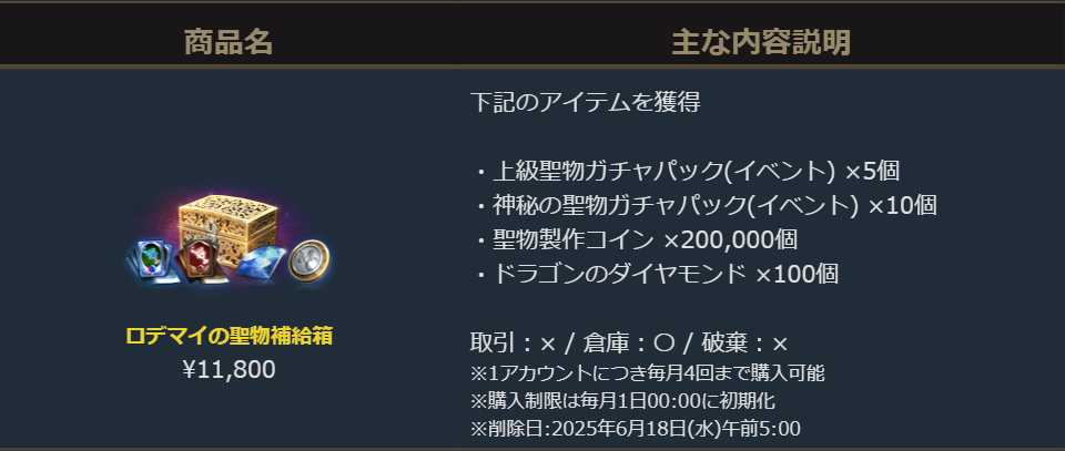 2025年5月14日より販売を開始しました「ロデマイの聖物補給箱」のご案内を申し上げます。