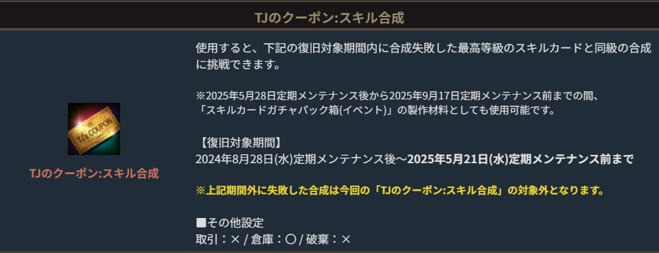 TJのクーポン:スキル合成は、対象期間内に合成失敗した最高等級のスキルカードの合成に再挑戦できる特別なアイテムです。