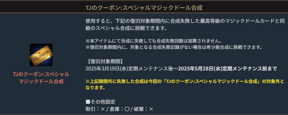 TJのクーポン:スペシャルマジックドール合成は、対象期間内に合成失敗した最高等級のマジックドールカードの合成に、成功時と失敗時の候補を選択して再挑戦できる特別なアイテムです。