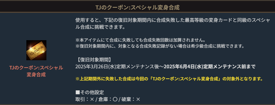 TJのクーポン:スペシャル変身合成は、対象期間内に合成失敗した最高等級の変身カードの合成に、成功時と失敗時の候補を選択して再挑戦できる特別なアイテムです。