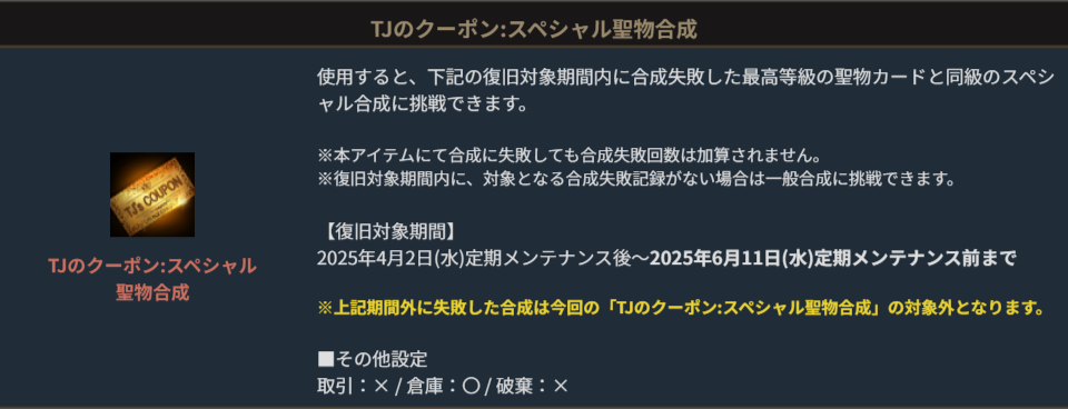 TJのクーポン:スペシャル聖物合成は、対象期間内に合成失敗した最高等級の聖物カードの合成に、成功時と失敗時の候補を選択して再挑戦できる特別なアイテムです。