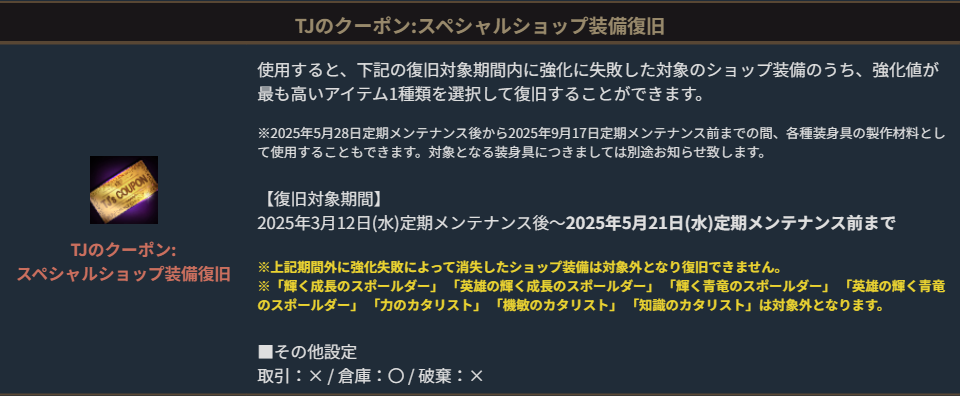 ※「TJのクーポン:復旧」と「TJのクーポン:スキル合成」は2025年5月28日(水)定期メンテナンス後から使用可能になります。