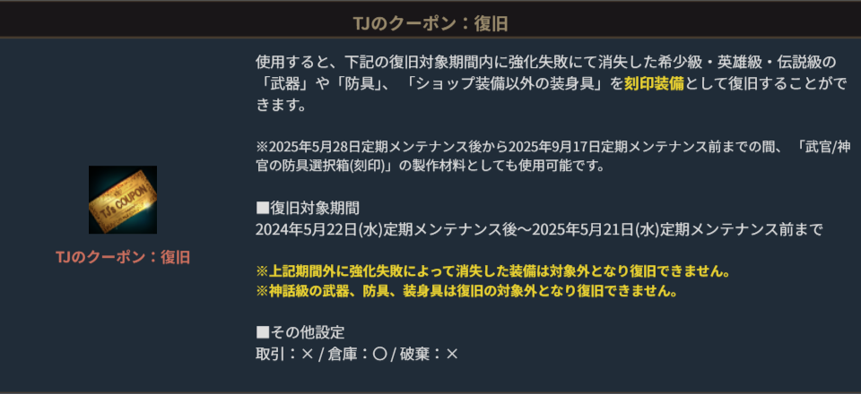 TJのクーポン:復旧は、対象期間中に希少級・英雄級・伝説級で強化失敗した「武器」や「防具」、「ショップ装備以外の装身具」を刻印装備として復旧することができる特別なアイテムです。