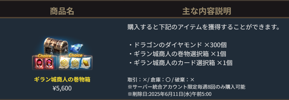 「ドラゴンのダイヤモンド」300個と「ギラン城商人の巻物選択箱」1個と一緒に、ガチャ券を1種選択して獲得できる「ギラン城商人のカード選択箱」1個が入ったパッケージです。