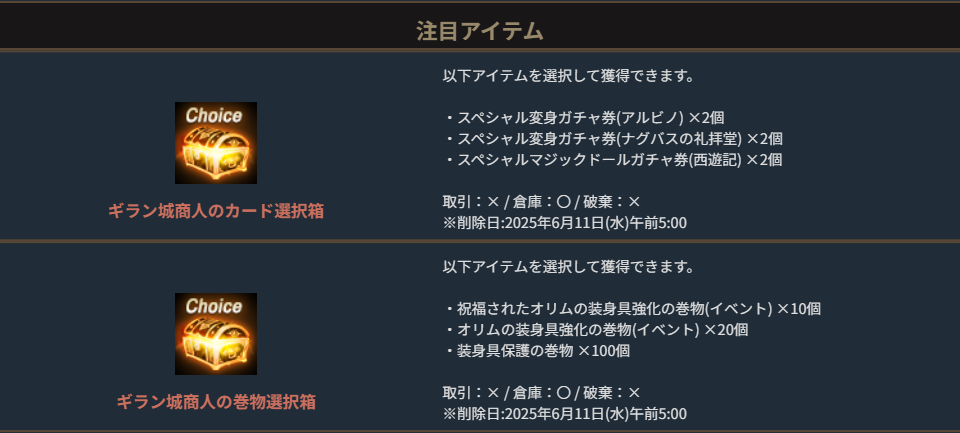 アイテム削除日を「2025年6月11日(水)午前5:00」⇒「2025年6月18日(水)午前5:00」に延長しました。