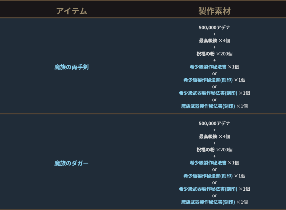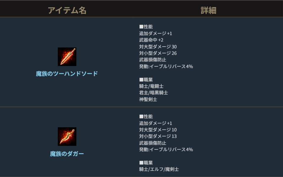 ・「魔族のダガー」「魔族のツーハンドソード」を混沌&秩序の錬金術の材料として使用可能になりました。
