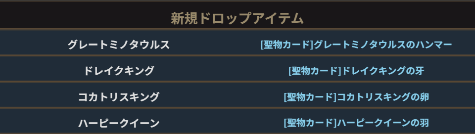 「忘れられた島」のボス4種にそれぞれ下記のドロップアイテムを追加しました。