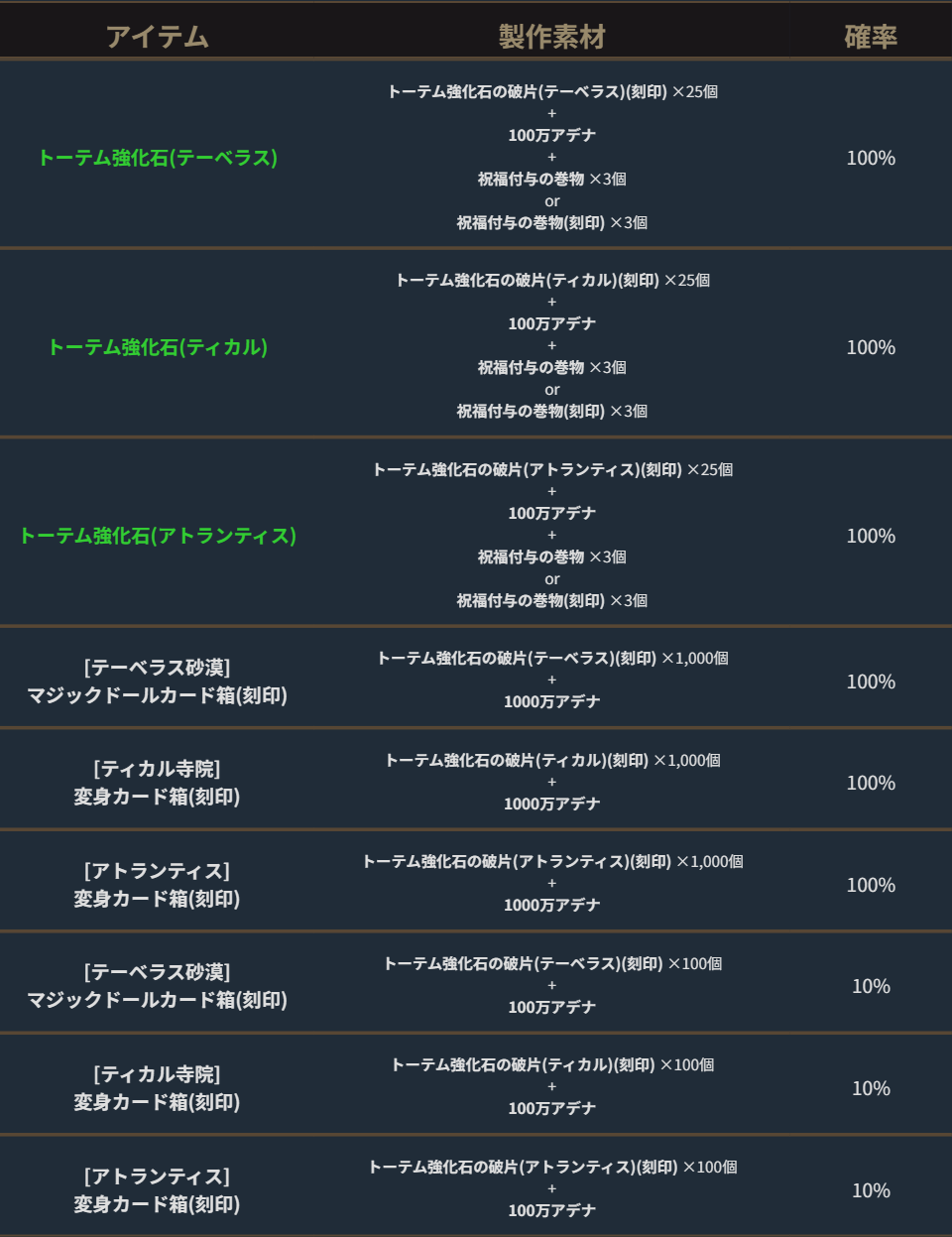 対象ダンジョンで獲得できる素材で、トーテム強化に使用するアイテムなどを製作することができます。