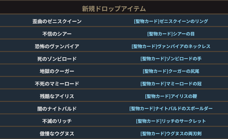 「傲慢の塔」のボス10種に新たな攻撃パターンを追加し、それぞれ下記のドロップアイテムを追加しました。
