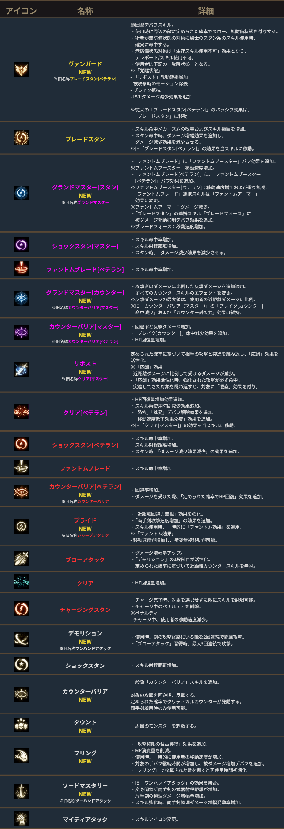 強力な状態異常「無防備状態」を付与する「ヴァンガード」や、ファントムブレードを強化する「グランドマスター:スタン」等の新規スキルを追加しました。