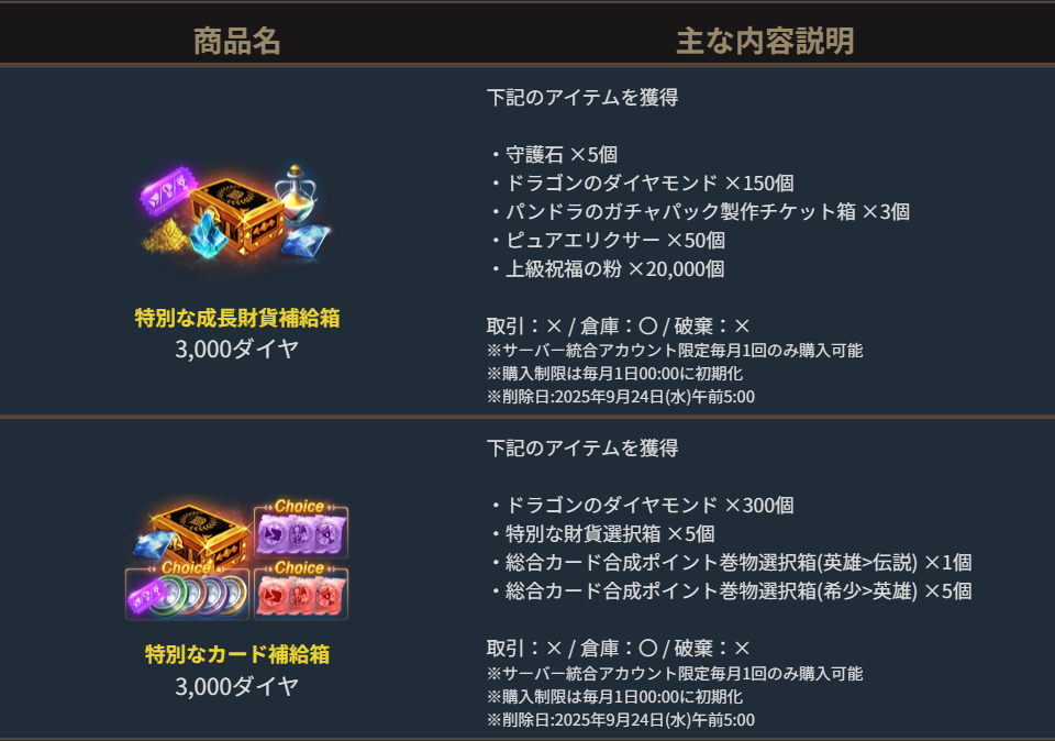 2025年6月4日より販売を開始しました「特別な成長財貨補給箱」と「特別なカード補給箱」のご案内を申し上げます。