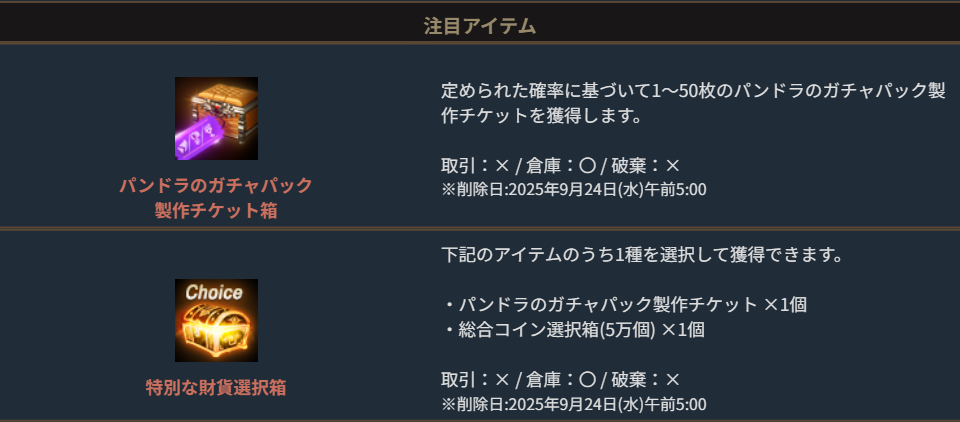 ※一部アイテムは未使用の場合、一定期間が経過すると自動で削除されます。詳しくは各アイテムの詳細をご確認ください。