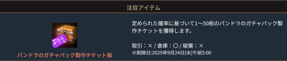 ※一部アイテムは未使用の場合、一定期間が経過すると自動で削除されます。詳しくは各アイテムの詳細をご確認ください。