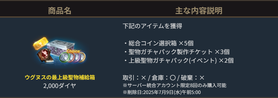2025年6月18日より販売を開始しました「ウグヌスの最上級聖物補給箱」のご案内を申し上げます。